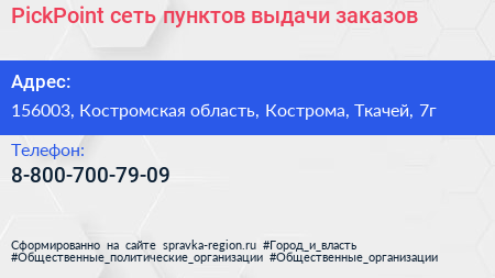 PickPoint, сеть пунктов выдачи заказов по адресу 156003, Костромская область, Кострома, Ткачей, 7г в дальнейшем Организация, размещена в следующих категориях: