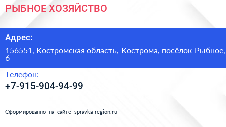 РЫБНОЕ ХОЗЯЙСТВО по адресу 156551, Костромская область, Кострома, посёлок Рыбное, 6 в дальнейшем Организация, размещена в следующих категориях: