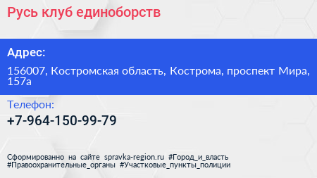 Русь, клуб единоборств по адресу 156007, Костромская область, Кострома, проспект Мира, 157а в дальнейшем Организация, размещена в следующих категориях:
