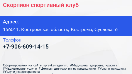 Скорпион, спортивный клуб по адресу 156011, Костромская область, Кострома, Суслова, 6 в дальнейшем Организация, размещена в следующих категориях: