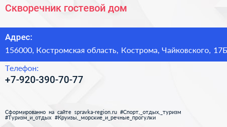 Скворечник, гостевой дом по адресу 156000, Костромская область, Кострома, Чайковского, 17Б в дальнейшем Организация, размещена в следующих категориях: