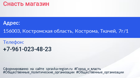 Снасть, магазин по адресу 156003, Костромская область, Кострома, Ткачей, 7г/1 в дальнейшем Организация, размещена в следующих категориях: