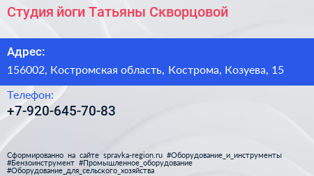 Студия йоги Татьяны Скворцовой по адресу 156002, Костромская область, Кострома, Козуева, 15 в дальнейшем Организация, размещена в следующих категориях: