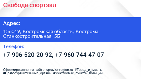 Свобода, спортзал по адресу 156019, Костромская область, Кострома, Станкостроительная, 5Б в дальнейшем Организация, размещена в следующих категориях: