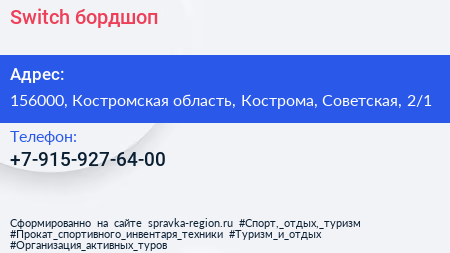 Switch, бордшоп по адресу 156000, Костромская область, Кострома, Советская, 2/1 в дальнейшем Организация, размещена в следующих категориях: