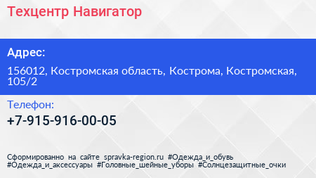 Техцентр Навигатор по адресу 156012, Костромская область, Кострома, Костромская, 105/2 в дальнейшем Организация, размещена в следующих категориях: