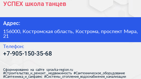 УСПЕХ, школа танцев по адресу 156000, Костромская область, Кострома, проспект Мира, 21 в дальнейшем Организация, размещена в следующих категориях: