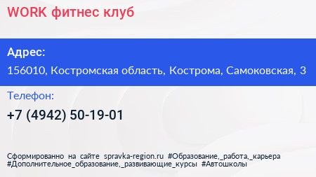 WORK, фитнес-клуб по адресу 156010, Костромская область, Кострома, Самоковская, 3 в дальнейшем Организация, размещена в следующих категориях: