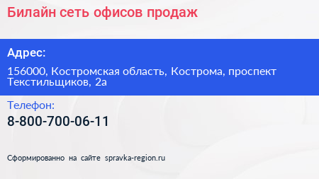 Билайн, сеть офисов продаж по адресу 156000, Костромская область, Кострома, проспект Текстильщиков, 2а в дальнейшем Организация, размещена в следующих категориях: