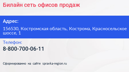Билайн, сеть офисов продаж по адресу 156530, Костромская область, Кострома, Красносельское шоссе, 1 в дальнейшем Организация, размещена в следующих категориях: