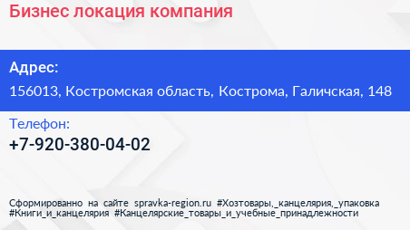 Бизнес локация, компания по адресу 156013, Костромская область, Кострома, Галичская, 148 в дальнейшем Организация, размещена в следующих категориях: