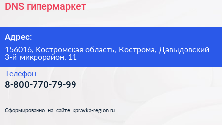 DNS, гипермаркет по адресу 156016, Костромская область, Кострома, Давыдовский 3-й микрорайон, 11 в дальнейшем Организация, размещена в следующих категориях:
