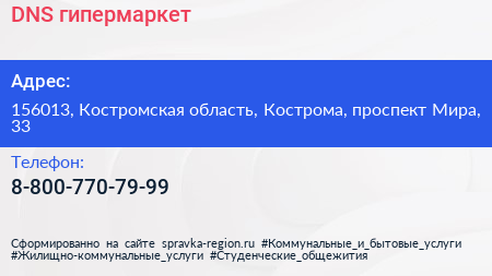 DNS, гипермаркет по адресу 156013, Костромская область, Кострома, проспект Мира, 33 в дальнейшем Организация, размещена в следующих категориях:
