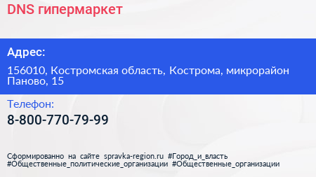 DNS, гипермаркет по адресу 156010, Костромская область, Кострома, микрорайон Паново, 15 в дальнейшем Организация, размещена в следующих категориях: