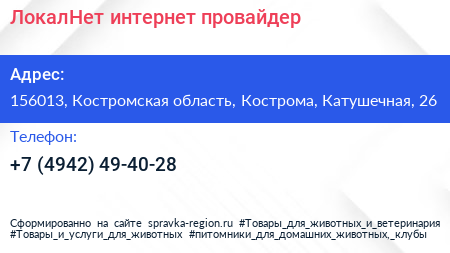 ЛокалНет, интернет-провайдер по адресу 156013, Костромская область, Кострома, Катушечная, 26 в дальнейшем Организация, размещена в следующих категориях: