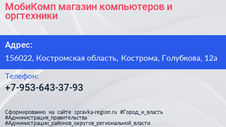 МобиКомп, магазин компьютеров и оргтехники по адресу 156022, Костромская область, Кострома, Голубкова, 12а в дальнейшем Организация, размещена в следующих категориях: