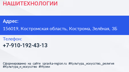 НАШИТЕХНОЛОГИИ по адресу 156019, Костромская область, Кострома, Зелёная, 3Б в дальнейшем Организация, размещена в следующих категориях: