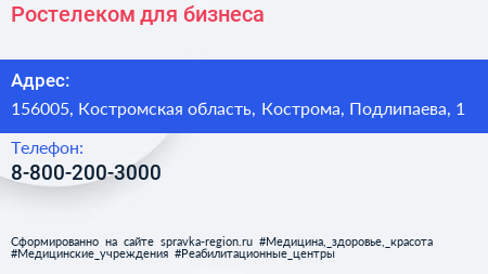 Ростелеком для бизнеса по адресу 156005, Костромская область, Кострома, Подлипаева, 1 в дальнейшем Организация, размещена в следующих категориях: