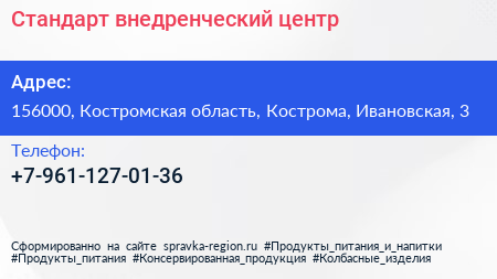 Стандарт, внедренческий центр по адресу 156000, Костромская область, Кострома, Ивановская, 3 в дальнейшем Организация, размещена в следующих категориях: