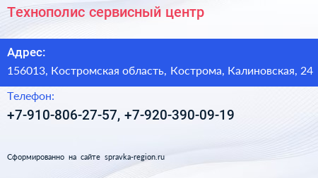 Технополис, сервисный центр по адресу 156013, Костромская область, Кострома, Калиновская, 24 в дальнейшем Организация, размещена в следующих категориях: