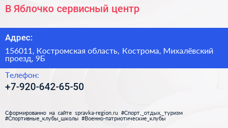 В Яблочко!, сервисный центр по адресу 156011, Костромская область, Кострома, Михалёвский проезд, 9Б в дальнейшем Организация, размещена в следующих категориях:
