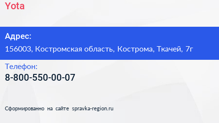 Yota по адресу 156003, Костромская область, Кострома, Ткачей, 7г в дальнейшем Организация, размещена в следующих категориях: