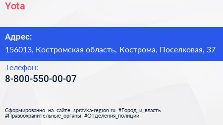 Yota по адресу 156013, Костромская область, Кострома, Поселковая, 37 в дальнейшем Организация, размещена в следующих категориях: