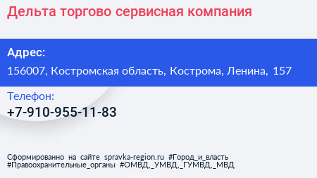 Дельта, торгово-сервисная компания по адресу 156007, Костромская область, Кострома, Ленина, 157 в дальнейшем Организация, размещена в следующих категориях: