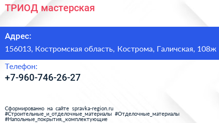 ТРИОД, мастерская по адресу 156013, Костромская область, Кострома, Галичская, 108ж в дальнейшем Организация, размещена в следующих категориях: