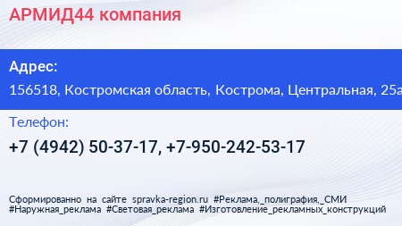 АРМИД44, компания по адресу 156518, Костромская область, Кострома, Центральная, 25а в дальнейшем Организация, размещена в следующих категориях: