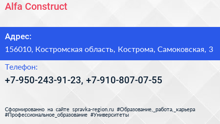 Alfa Construct по адресу 156010, Костромская область, Кострома, Самоковская, 3 в дальнейшем Организация, размещена в следующих категориях: