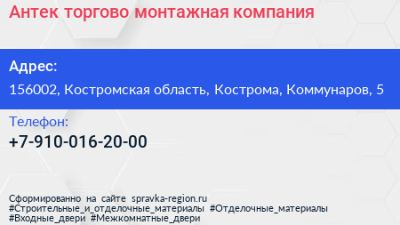 Антек, торгово-монтажная компания по адресу 156002, Костромская область, Кострома, Коммунаров, 5 в дальнейшем Организация, размещена в следующих категориях: