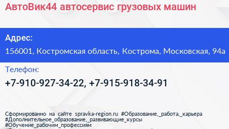 АвтоВик44, автосервис грузовых машин по адресу 156001, Костромская область, Кострома, Московская, 94а в дальнейшем Организация, размещена в следующих категориях: