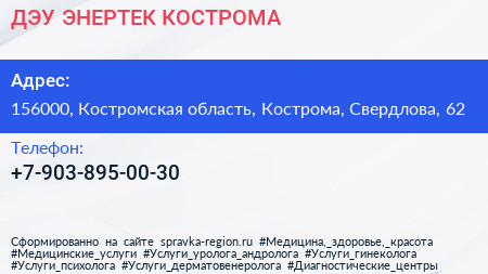 ДЭУ ЭНЕРТЕК-КОСТРОМА по адресу 156000, Костромская область, Кострома, Свердлова, 62 в дальнейшем Организация, размещена в следующих категориях: