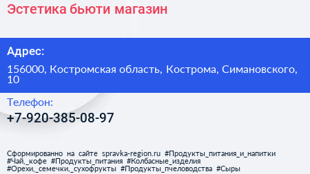 Эстетика, бьюти-магазин по адресу 156000, Костромская область, Кострома, Симановского, 10 в дальнейшем Организация, размещена в следующих категориях: