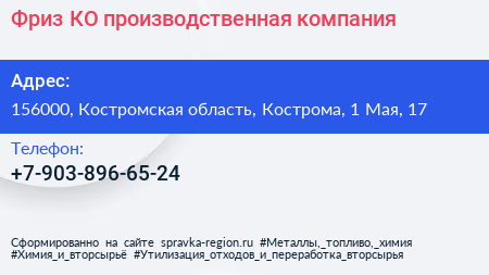 Фриз-КО, производственная компания по адресу 156000, Костромская область, Кострома, 1 Мая, 17 в дальнейшем Организация, размещена в следующих категориях: