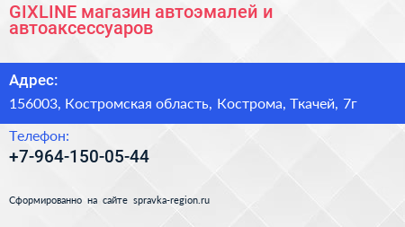 GIXLINE, магазин автоэмалей и автоаксессуаров по адресу 156003, Костромская область, Кострома, Ткачей, 7г в дальнейшем Организация, размещена в следующих категориях: