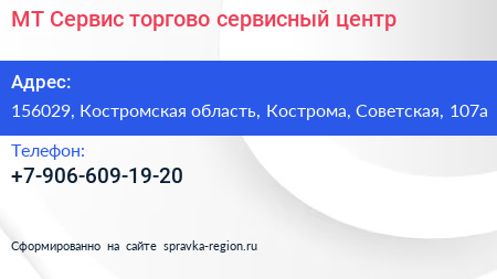 МТ Сервис, торгово сервисный центр по адресу 156029, Костромская область, Кострома, Советская, 107а в дальнейшем Организация, размещена в следующих категориях: