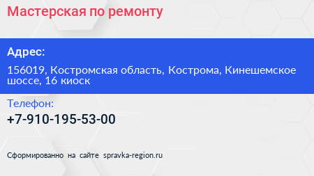 Мастерская по ремонту по адресу 156019, Костромская область, Кострома, Кинешемское шоссе, 16 киоск в дальнейшем Организация, размещена в следующих категориях: