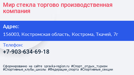 Мир стекла, торгово-производственная компания по адресу 156003, Костромская область, Кострома, Ткачей, 7г в дальнейшем Организация, размещена в следующих категориях: