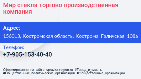 Мир стекла, торгово-производственная компания по адресу 156013, Костромская область, Кострома, Галичская, 108а в дальнейшем Организация, размещена в следующих категориях: