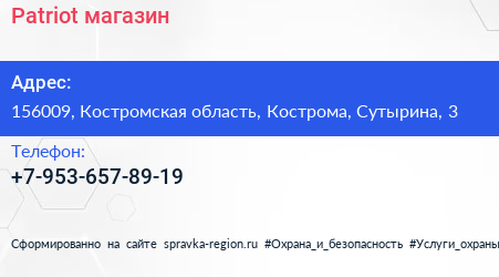 Patriot, магазин по адресу 156009, Костромская область, Кострома, Сутырина, 3 в дальнейшем Организация, размещена в следующих категориях: