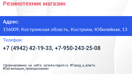 Резинотехник, магазин по адресу 156009, Костромская область, Кострома, Юбилейная, 13 в дальнейшем Организация, размещена в следующих категориях: