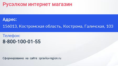 Русэлком, интернет-магазин по адресу 156013, Костромская область, Кострома, Галичская, 103 в дальнейшем Организация, размещена в следующих категориях: