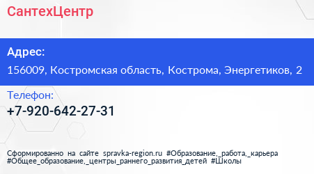 СантехЦентр по адресу 156009, Костромская область, Кострома, Энергетиков, 2 в дальнейшем Организация, размещена в следующих категориях: