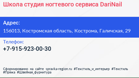 Школа-студия ногтевого сервиса DariNail по адресу 156013, Костромская область, Кострома, Галичская, 29 в дальнейшем Организация, размещена в следующих категориях: