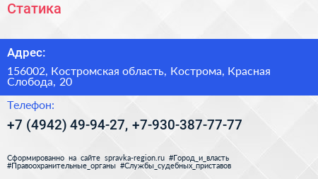Статика по адресу 156002, Костромская область, Кострома, Красная Слобода, 20 в дальнейшем Организация, размещена в следующих категориях: