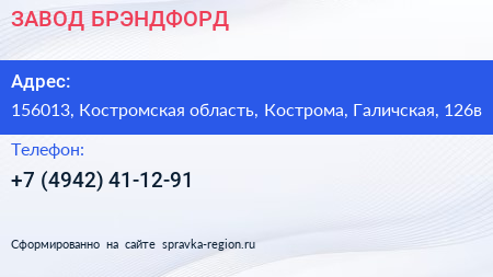 ЗАВОД БРЭНДФОРД по адресу 156013, Костромская область, Кострома, Галичская, 126в в дальнейшем Организация, размещена в следующих категориях: