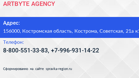 ARTBYTE.AGENCY по адресу 156000, Костромская область, Кострома, Советская, 21а к1 в дальнейшем Организация, размещена в следующих категориях:
