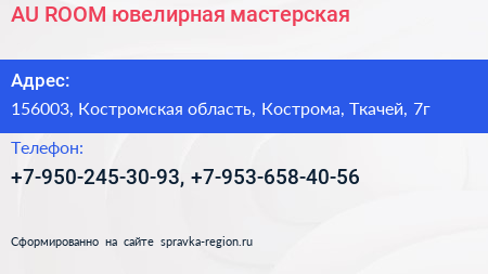 AU ROOM, ювелирная мастерская по адресу 156003, Костромская область, Кострома, Ткачей, 7г в дальнейшем Организация, размещена в следующих категориях:
